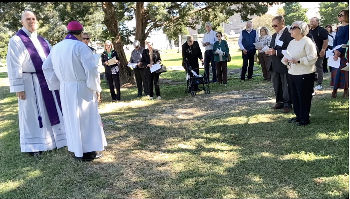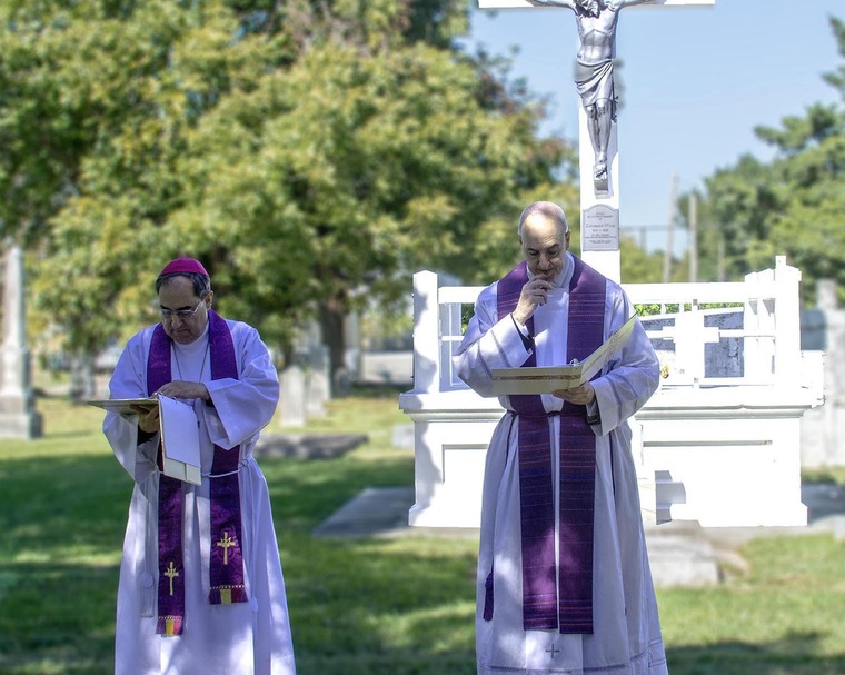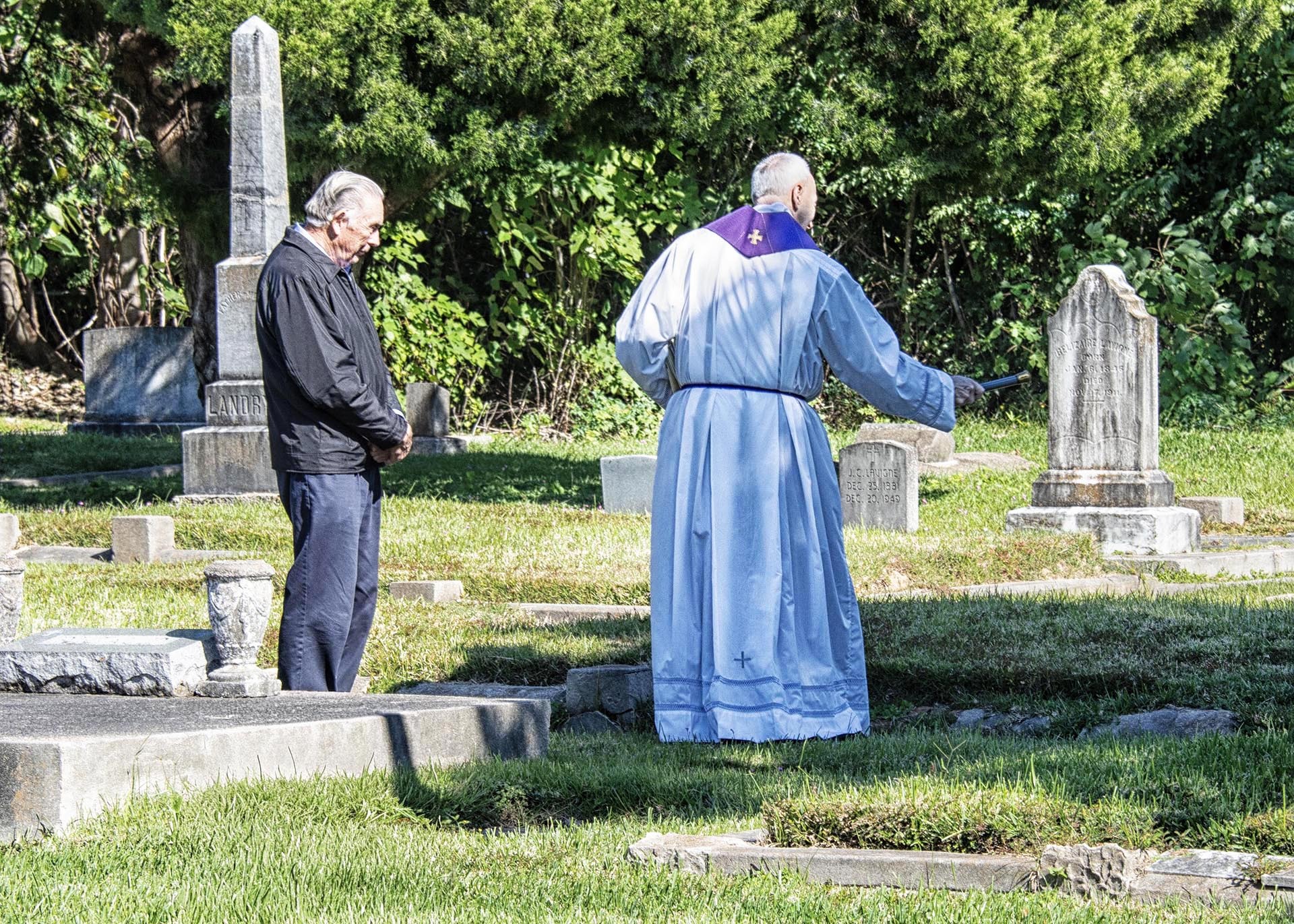 Parishes throughout the Diocese of Baton Rouge blessed graves to commemorate All Saints and All Souls Day on Nov. 1-2. The blessing of the graves at St. Joseph Cemetery in Baton Rouge also marked the end of the year-long celebration of the 200th anniversary of the cemetery. Bishop Michael G. Duca and Father Cary Bani led the prayer service, followed by the blessing of the graves. Pictured accompanying Bishop Michael G. Duca is Eloise Verbois Landry as the bishop blesses the Verbois and Grand Pre family graves. Also pictured with Father Bani is James Robert during the blessing of graves. Photos by Marilyn Goff and Debbie Shelley | The Catholic Commentator
