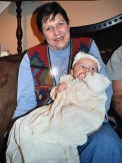 Francesca Oresta Drude Pevy (now deceased) holding her great-granddaughter, Brinley Ann Smith, in the baptismal gown in August 2012.